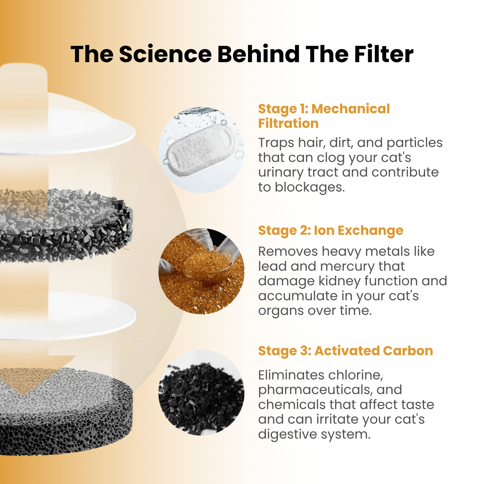 The Triple Action Carbon filter removes magnesium, calcium, hair, dirt and other impurities from your cats water. These minerals can accumulate in your pet’s lower urinary tract and lead to urinary tract infection.