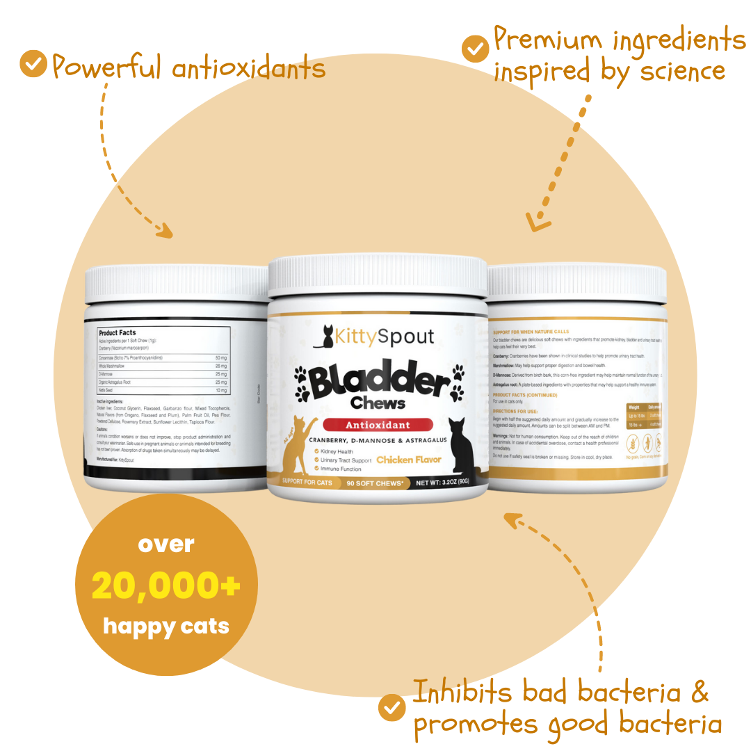 Unlike regular cat chews, our Bladder & Kidney Support Chews are filled with powerful antioxidants that support your cat's health by inhibiting bad bacteria in the gut and promoting good bacteria.