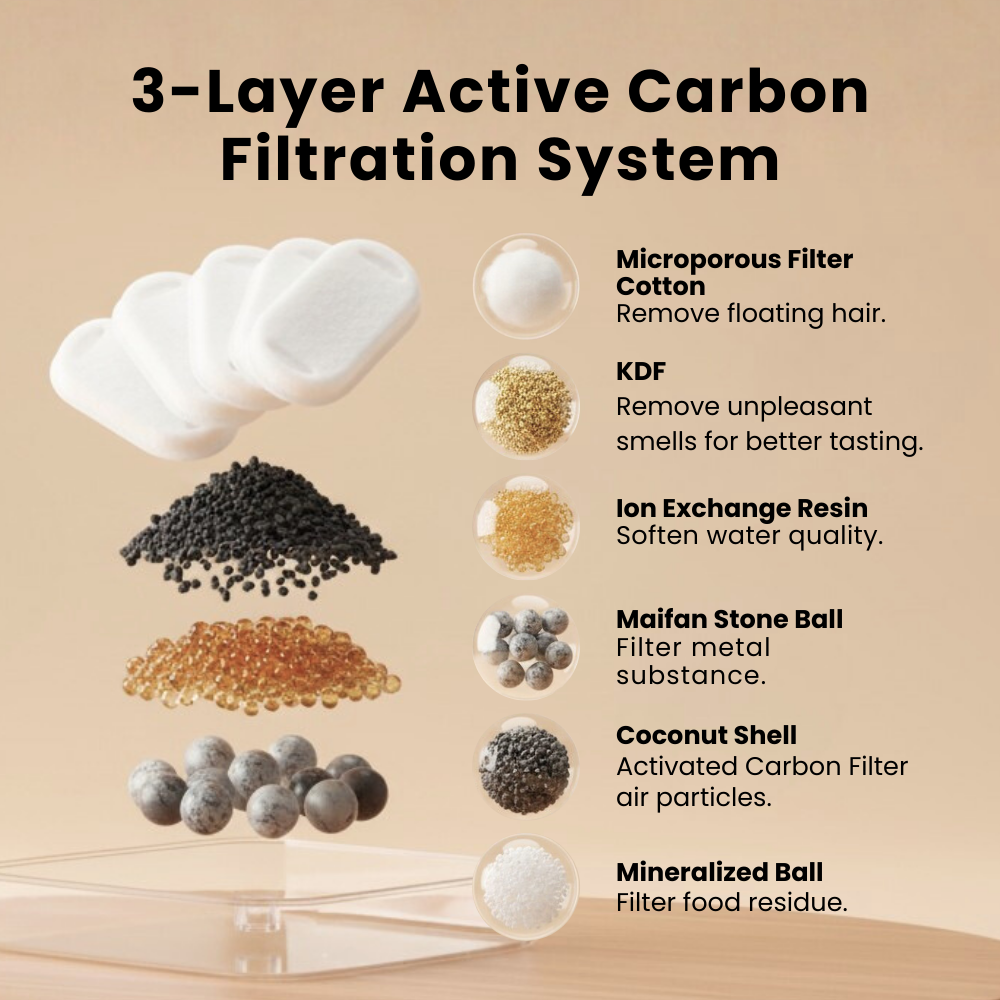 - 1x 2-Month Supply of Filters – 2 month supply of three Layer Active Carbon Filters that keep water pure and clean, giving you half a year of peace of mind and ensuring clean water for your fur-baby.